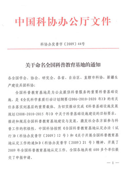 2009年9月,中國科協(xié)組織開展了為期3個(gè)月的第一、二批全國科普教育基地綜合評估工作,我單位也積極遞交了全國科普教育基地的申請。經(jīng)全國學(xué)會(huì)、省級科協(xié)等推薦單位對本轄區(qū)、本系統(tǒng)全國科普教育基地的測評,中國科協(xié)組織專家進(jìn)行了細(xì)致認(rèn)真的評審和抽查,全國僅認(rèn)定科普教育基地200多家。我單位以良好的硬件設(shè)施和突出的科普工作業(yè)績在數(shù)百家申報(bào)單位中脫穎而出,順利通過認(rèn)定,成為全國微量元素領(lǐng)域中唯一一家被國家科協(xié)命名的科普教育基地。