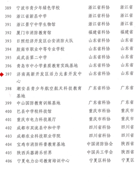 濟(jì)南高新開發(fā)區(qū)活力元素開發(fā)中心于2009年12月被中國科協(xié)命名為“全國科普教育基地”,這是繼2007年10月被山東省科協(xié)命名為“山東省科普教育基地”、2008年9月被濟(jì)南市科協(xié)命名為“濟(jì)南市科普教育基地”之后,獲得的又一項(xiàng)榮譽(yù)。