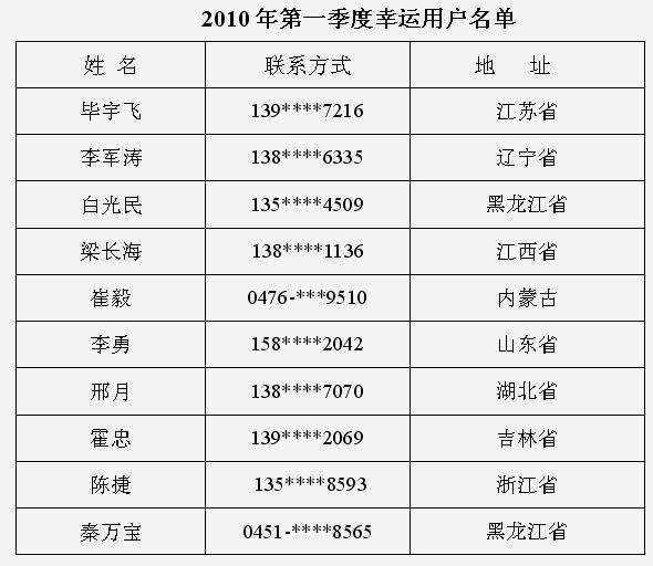 2010年第一季度新稀寶幸運(yùn)用戶名單