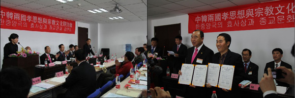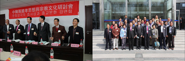 2011年4月13日,"中韓兩國(guó)孝思想與宗教文化學(xué)術(shù)研討會(huì)暨兩國(guó)學(xué)術(shù)機(jī)構(gòu)、團(tuán)體交流協(xié)議簽約儀式"在山東大學(xué)儒學(xué)高等研究院舉行。本次研討會(huì)由山東大學(xué)儒學(xué)高等研究院、韓國(guó)圣山孝道大學(xué)院、濟(jì)南市傳統(tǒng)文化研究會(huì)、韓國(guó)大田廣域市孝指導(dǎo)士協(xié)會(huì)等單位主辦,山東省老齡委孝文化專業(yè)委員會(huì)、韓國(guó)大田廣域市、韓國(guó)孝運(yùn)動(dòng)中央總會(huì)、韓國(guó)大田廣域市孝實(shí)踐運(yùn)動(dòng)本部聯(lián)合承辦。會(huì)議由山東大學(xué)儒學(xué)高等研究院副院長(zhǎng)顏炳罡教授主持,來(lái)自中、韓兩國(guó)的專家學(xué)者逾80人參加了此次研討會(huì)。