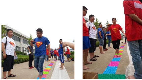 “心有靈犀”結束后,藍隊紅隊穿好隊服轉戰(zhàn)到戶外,大家的激情遠遠超過了戶外天氣的熱度。主持人剛剛講解完比賽規(guī)則,大家就投入到了比賽活動中,一個個隊員光著腳板在指壓板上快速前進,手上還小心翼翼的用乒乓球拍端著乒乓球,眼睛目不轉睛的盯著球拍上的乒乓球,臉上用各種表情來表達腳板的感覺和對球拍上乒乓球的關注。每個隊員都成功的端著球走過了指壓板,大家熱烈地討論并分享著自己的感受。