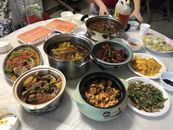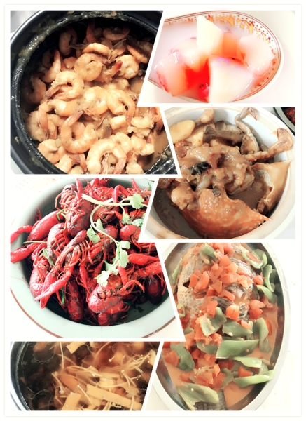 沒想到平時工作能力杠杠的同事們,做起菜來也絲毫不遜色。沒過多久菜已經(jīng)陸續(xù)上桌,有毛毛做的紅燒魚與水煮牛肉,米粒做的菜包釀、咸蛋炒南瓜;陶大神做的 佛跳墻、蟹黃煲、椰香蝦;潤姐的燒鴨、西芹紅椒炒白果、涼拌木耳;寧寧的炒花甲螺;振宇做的青椒炒肉;芳芳的芒果西米露。一大桌菜色香味俱全、品種多樣, 飯前涼菜、家常炒菜、營養(yǎng)豐盛的大菜以及飯后甜點應有盡有。
