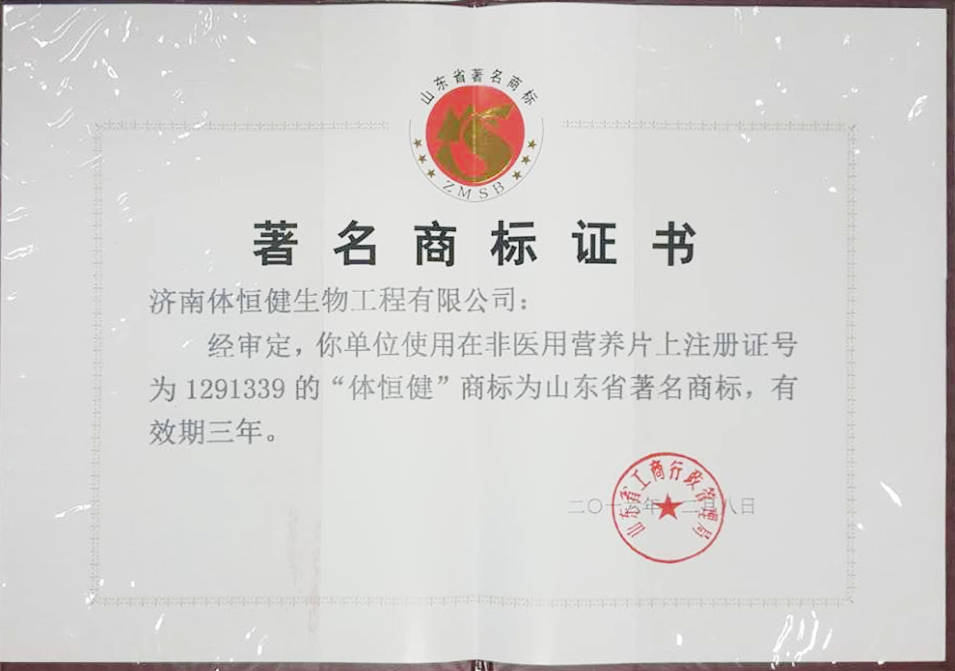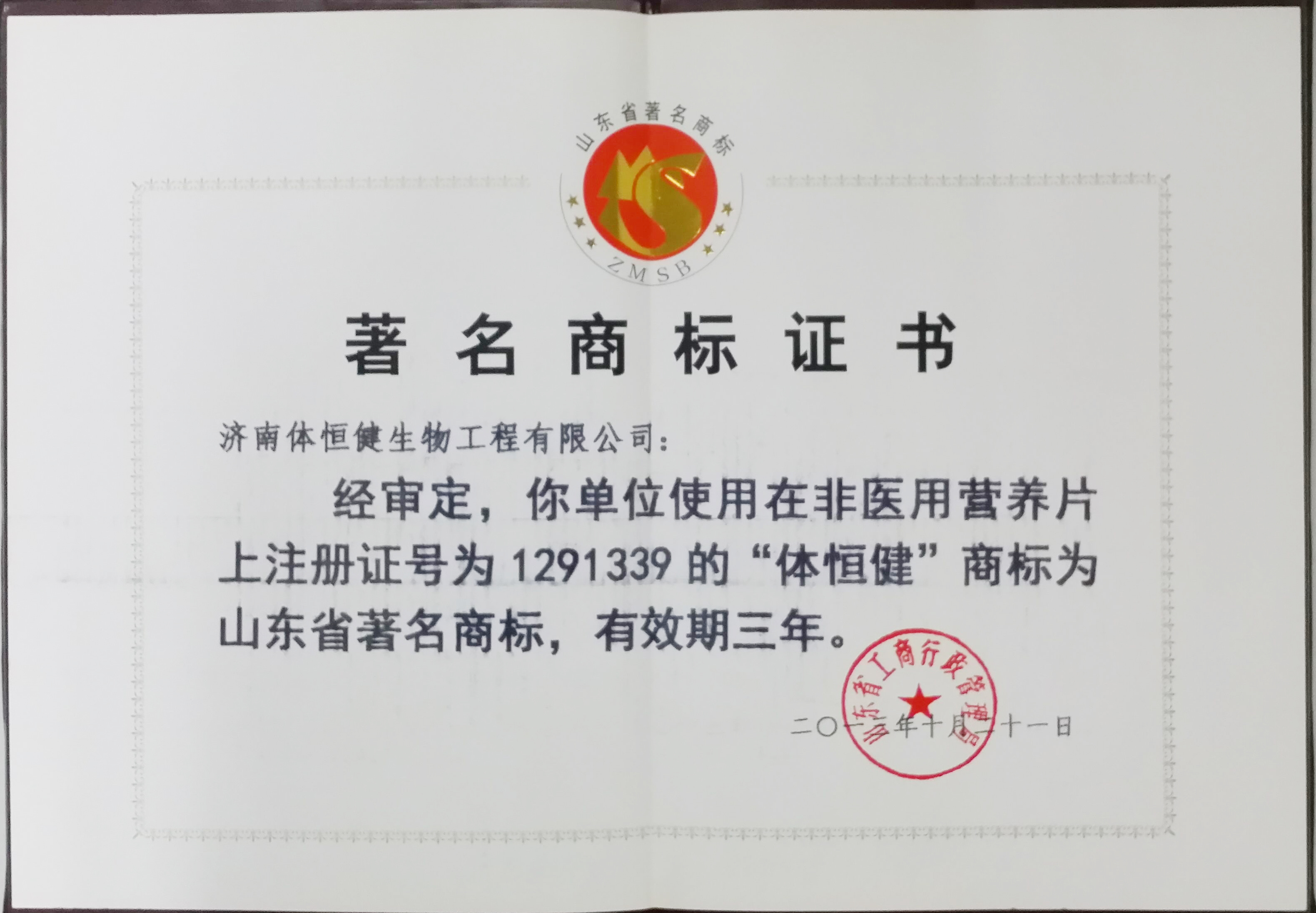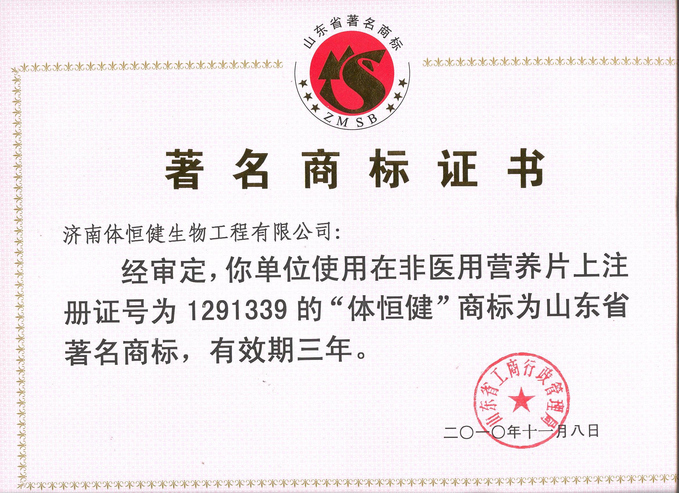 2010年,“體恒健”被 山東省工商行政管理局評為“山東省著名商標”
