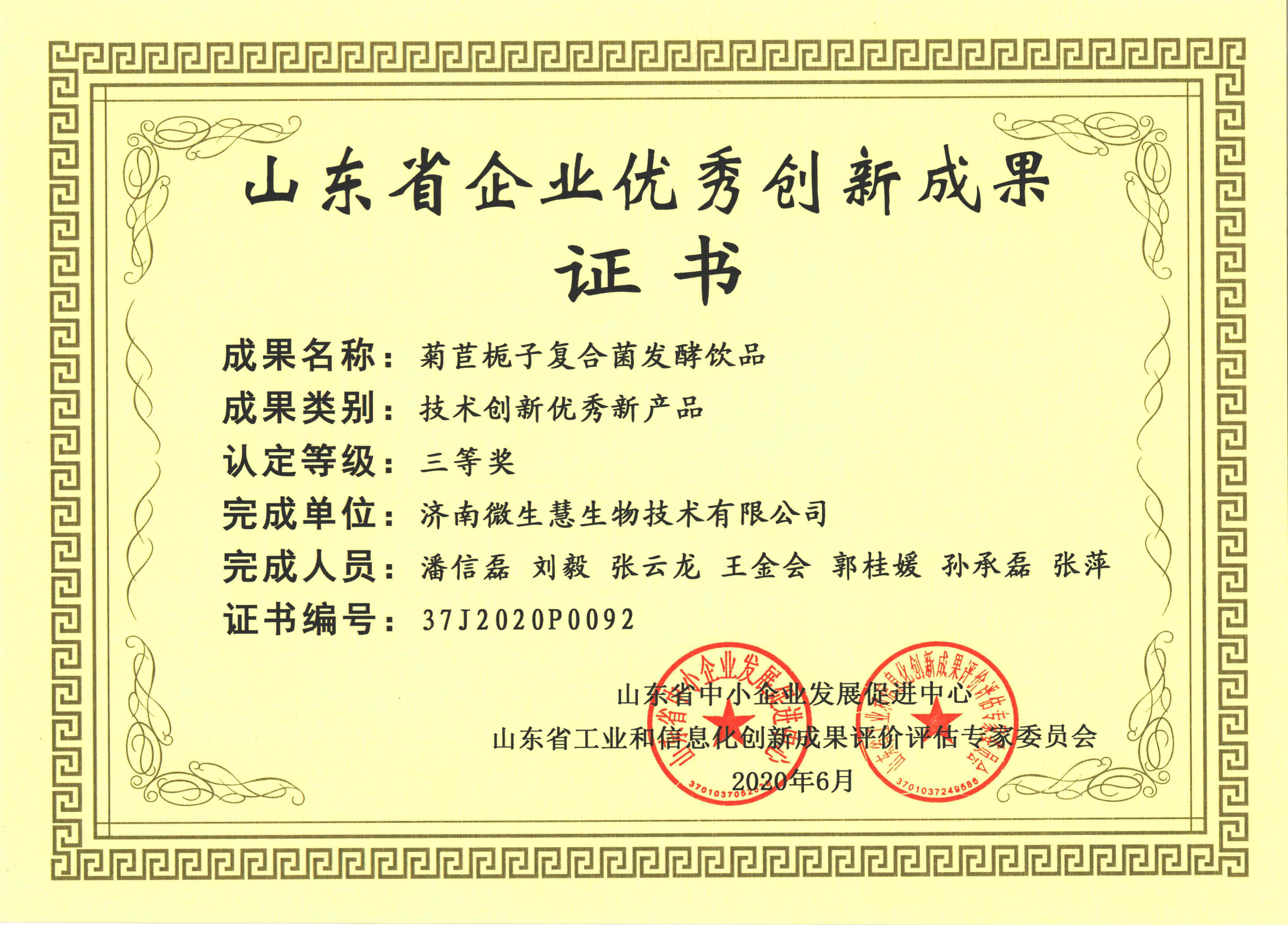 菊苣梔子復(fù)合菌發(fā)酵飲品獲得技術(shù)創(chuàng)新優(yōu)秀新產(chǎn)品三等獎(jiǎng)